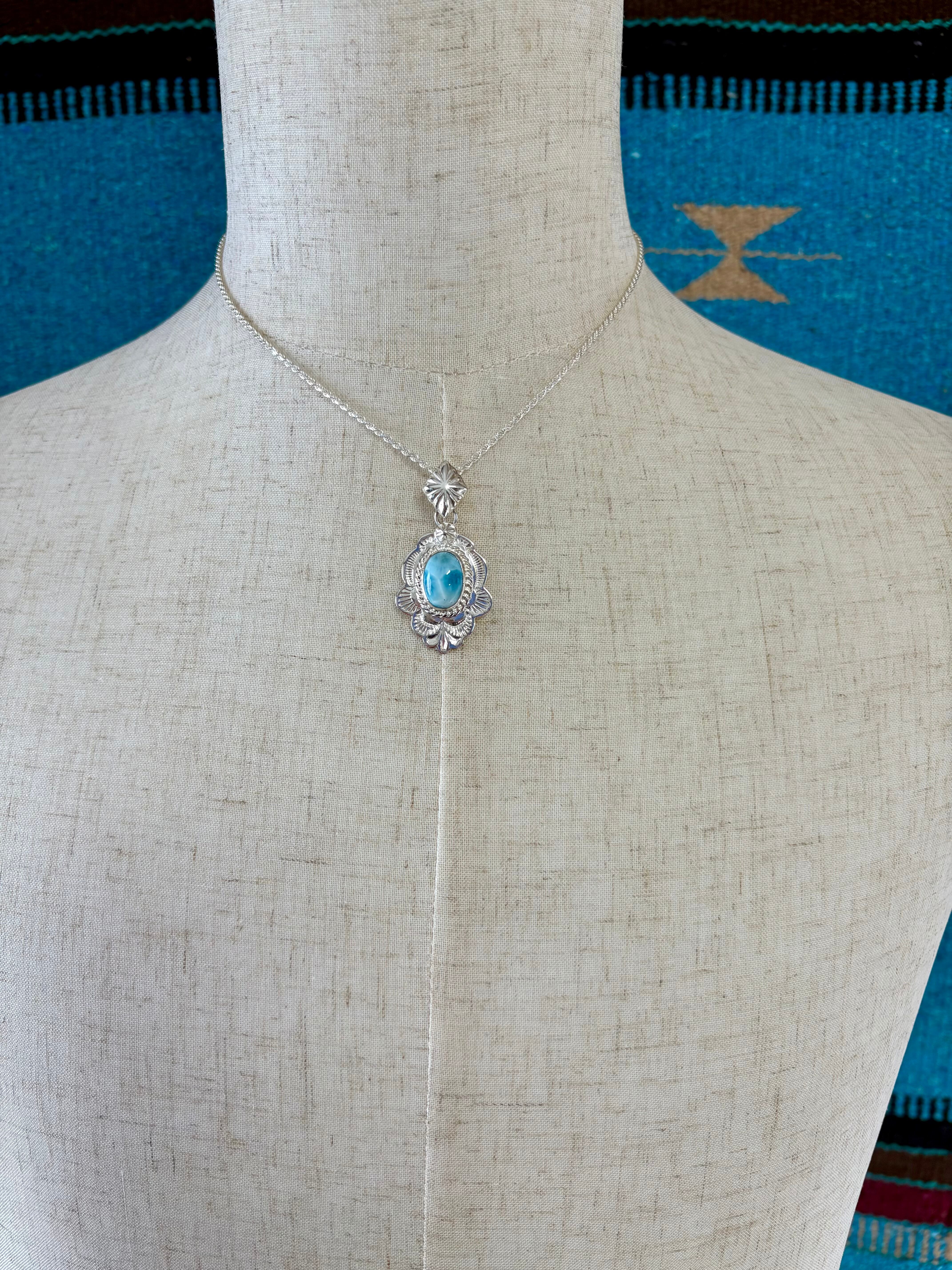 カリブ海の海のように美しいブルーの中にキラキラと光水面のようなの模様が綺麗に入ったラリマーを石の形に合わせてスタンプワークを施したペンダントに仕上げました。