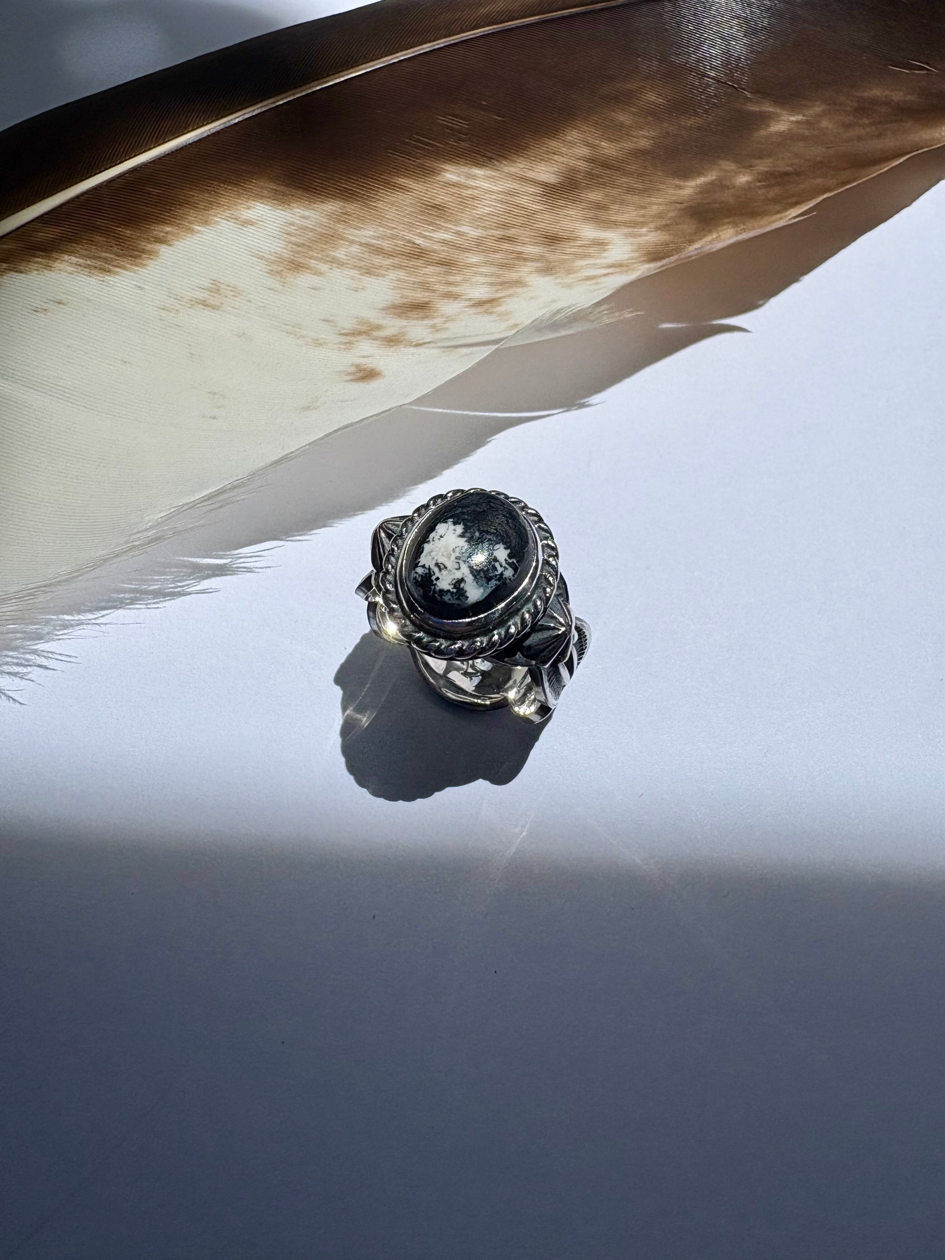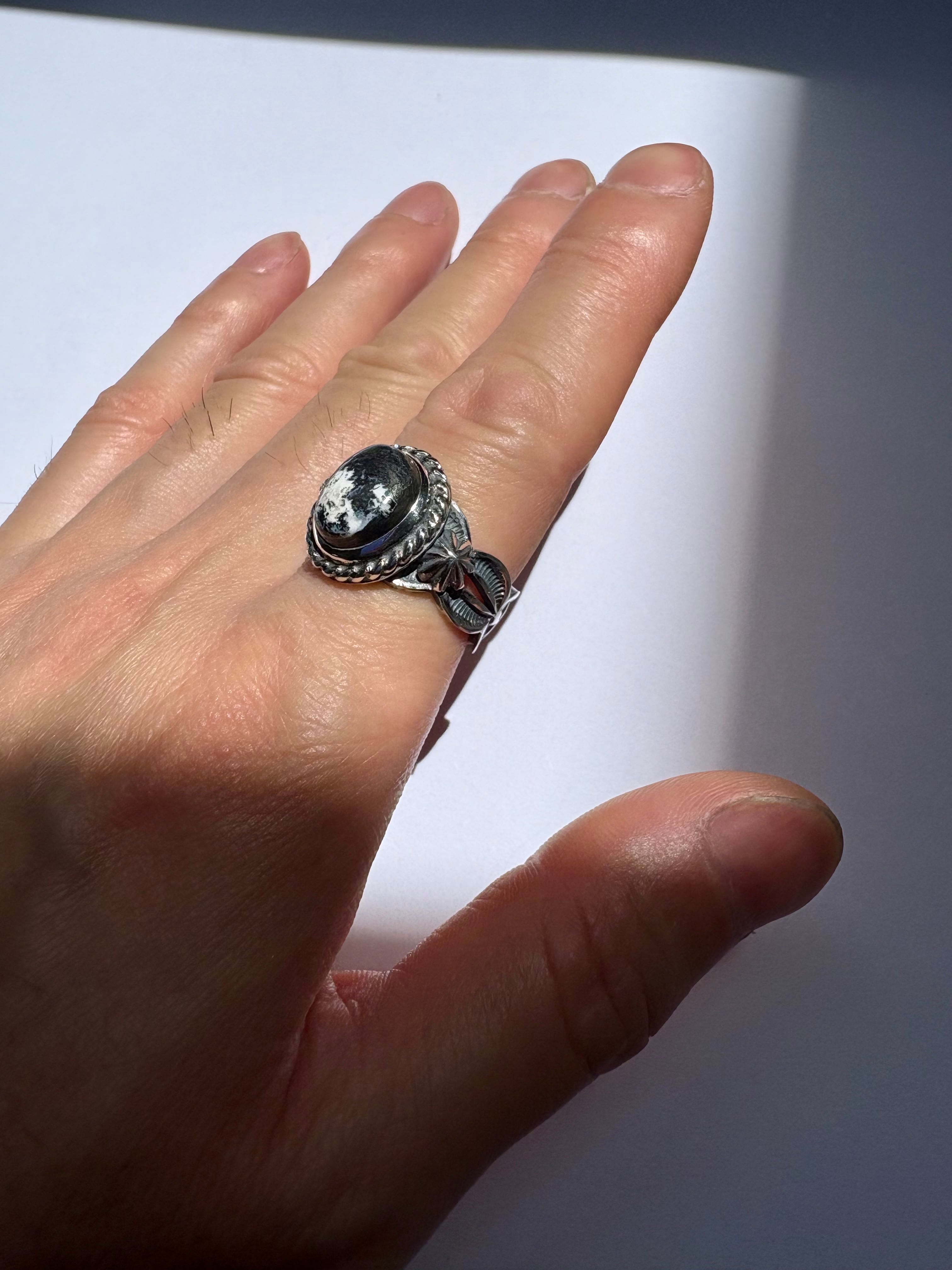 今回入手する出来ましたブラックベースにホワイトがバランスよく入っているホワイトバッファローをツイストワイヤーで石を囲み、燻し仕上げにする事によりシックな印象の仕上げましたリングになります。