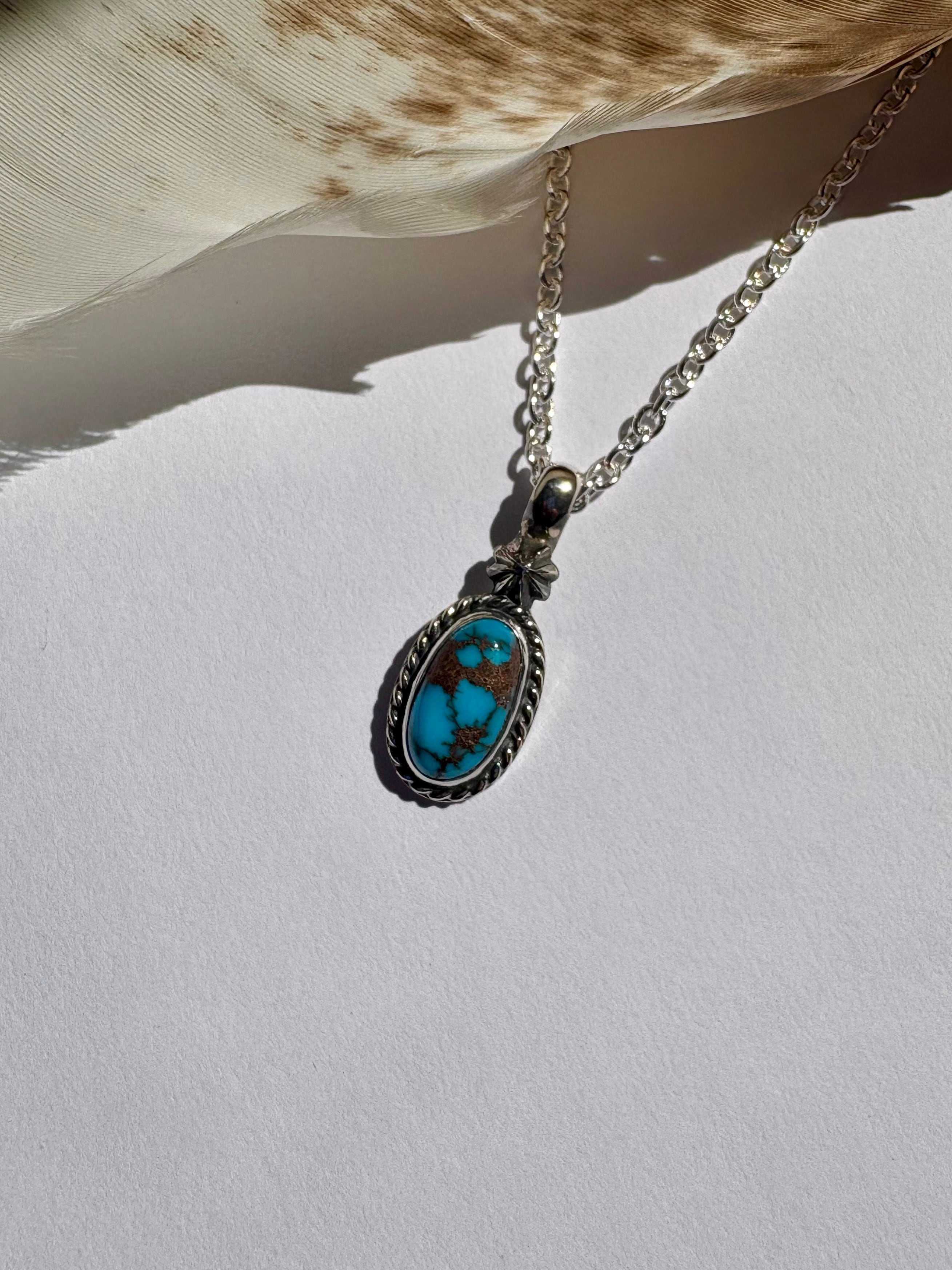 深みのあるブルーに赤茶のスパイダーウェブが綺麗なハイグレードエジプシャンターコイズをペンダントに仕上げました。