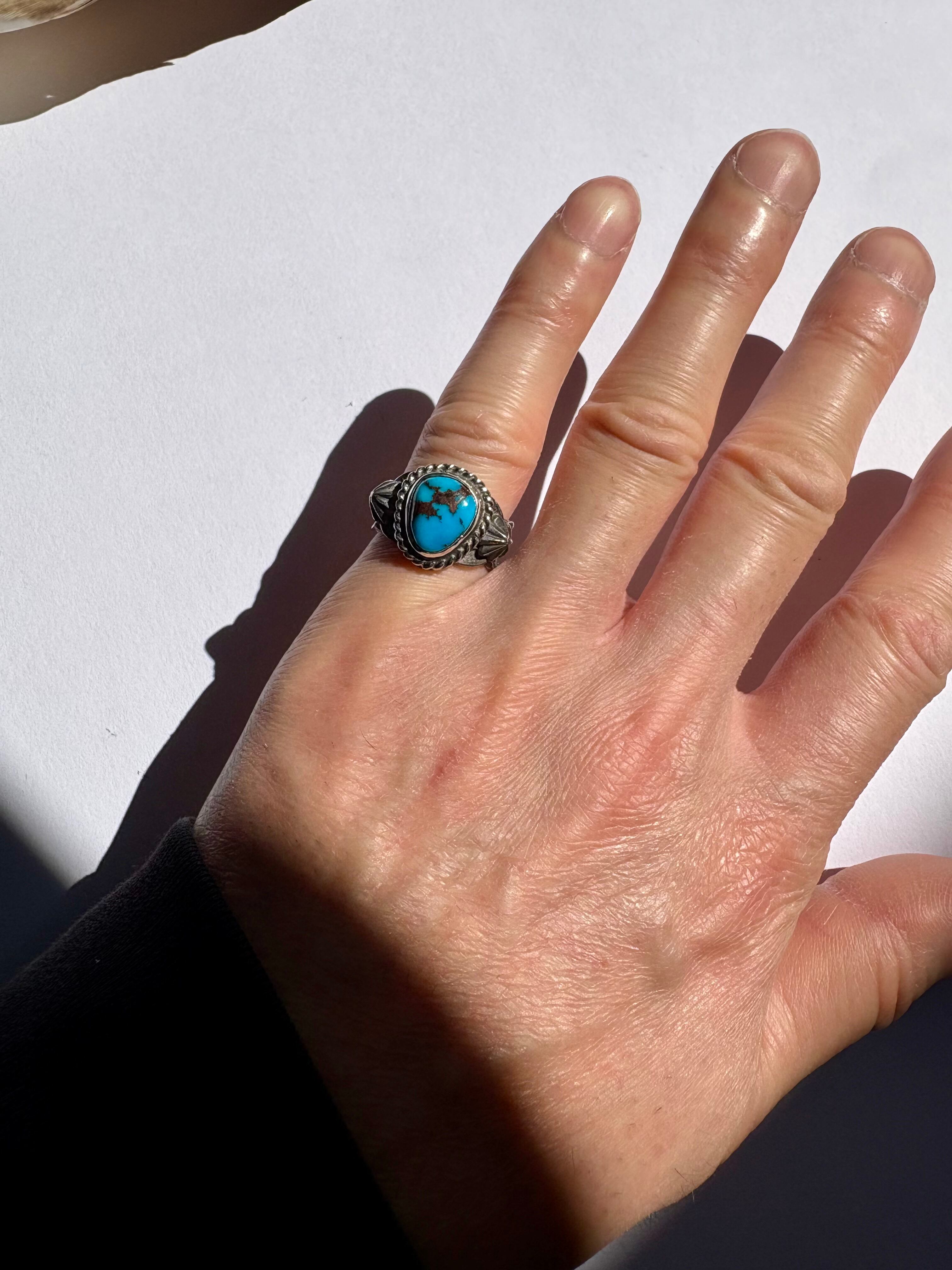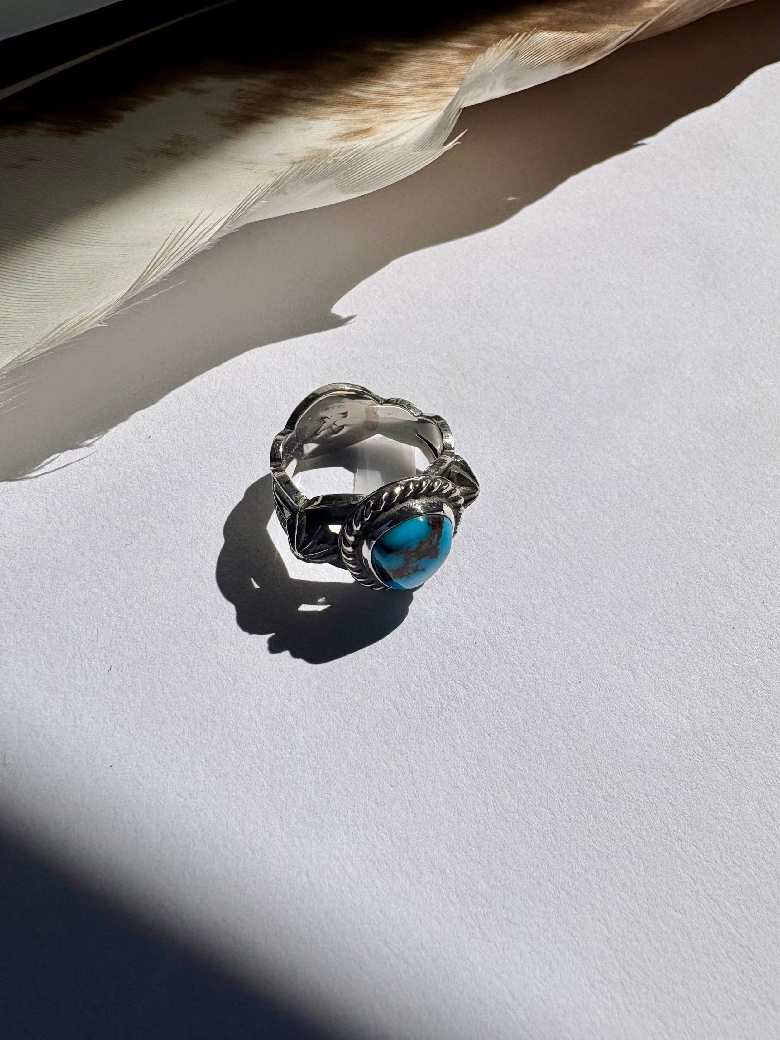 深いブルーが印象的なハイグレードエジプシャンターコイズを使いインディアンジュエリーらしいリングに仕上げました。