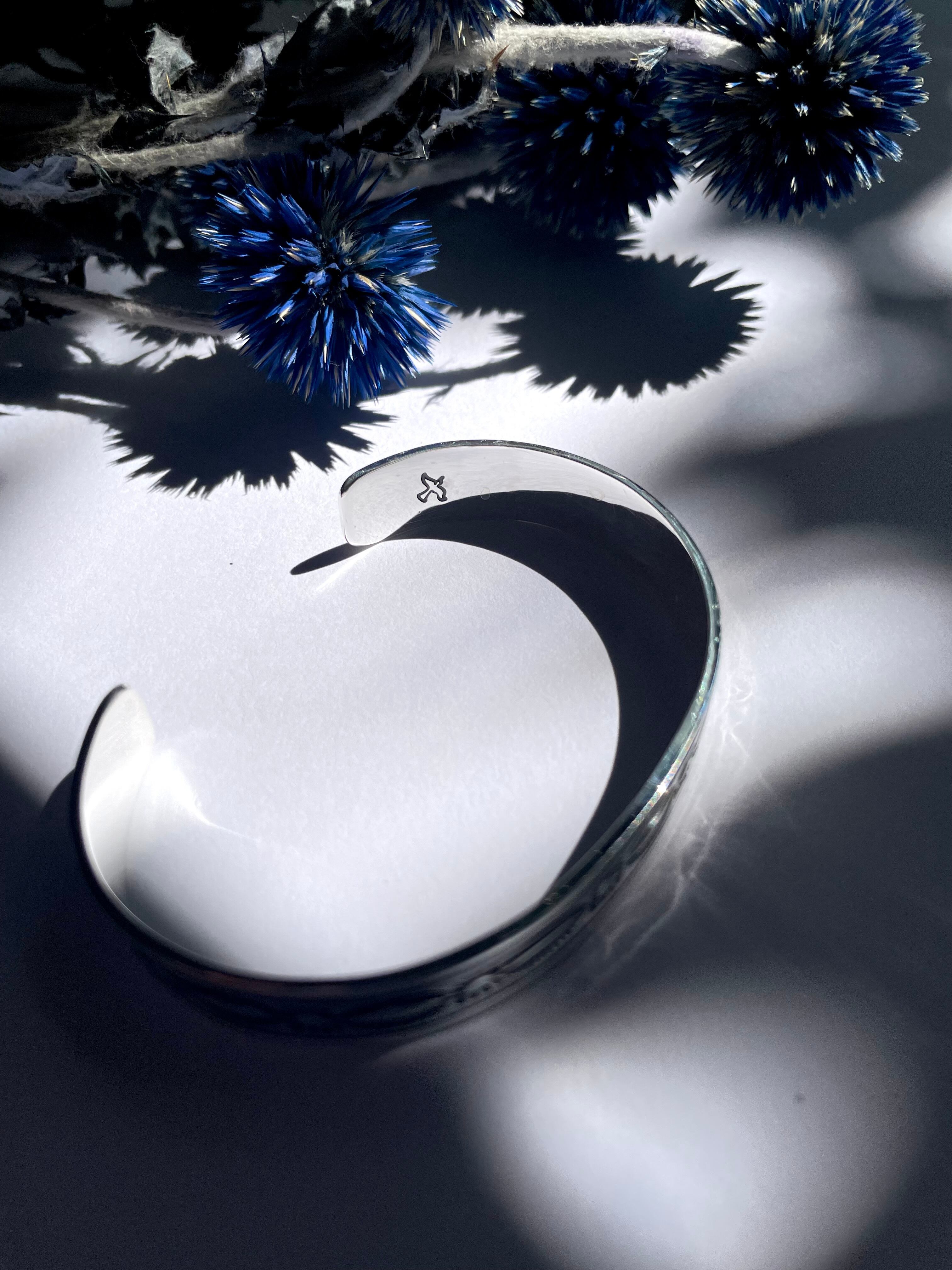 Stamp work Bangle インディアンジュエリーらしいスタンプワークを施したスタイリッシュなバングルです。 以前のタイプよりも少し太めにリニューアルした事により、一本で身につけてもよりしっかりとした存在感を出す事が出来ました。 ギフトとしてもオススメです。 Stamp work Bangle 幅約11mm 素材 silver
