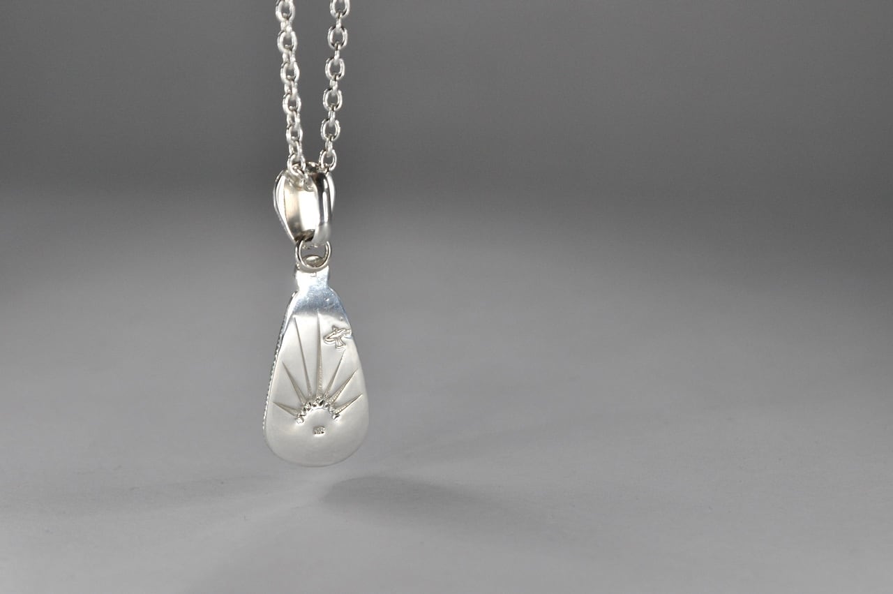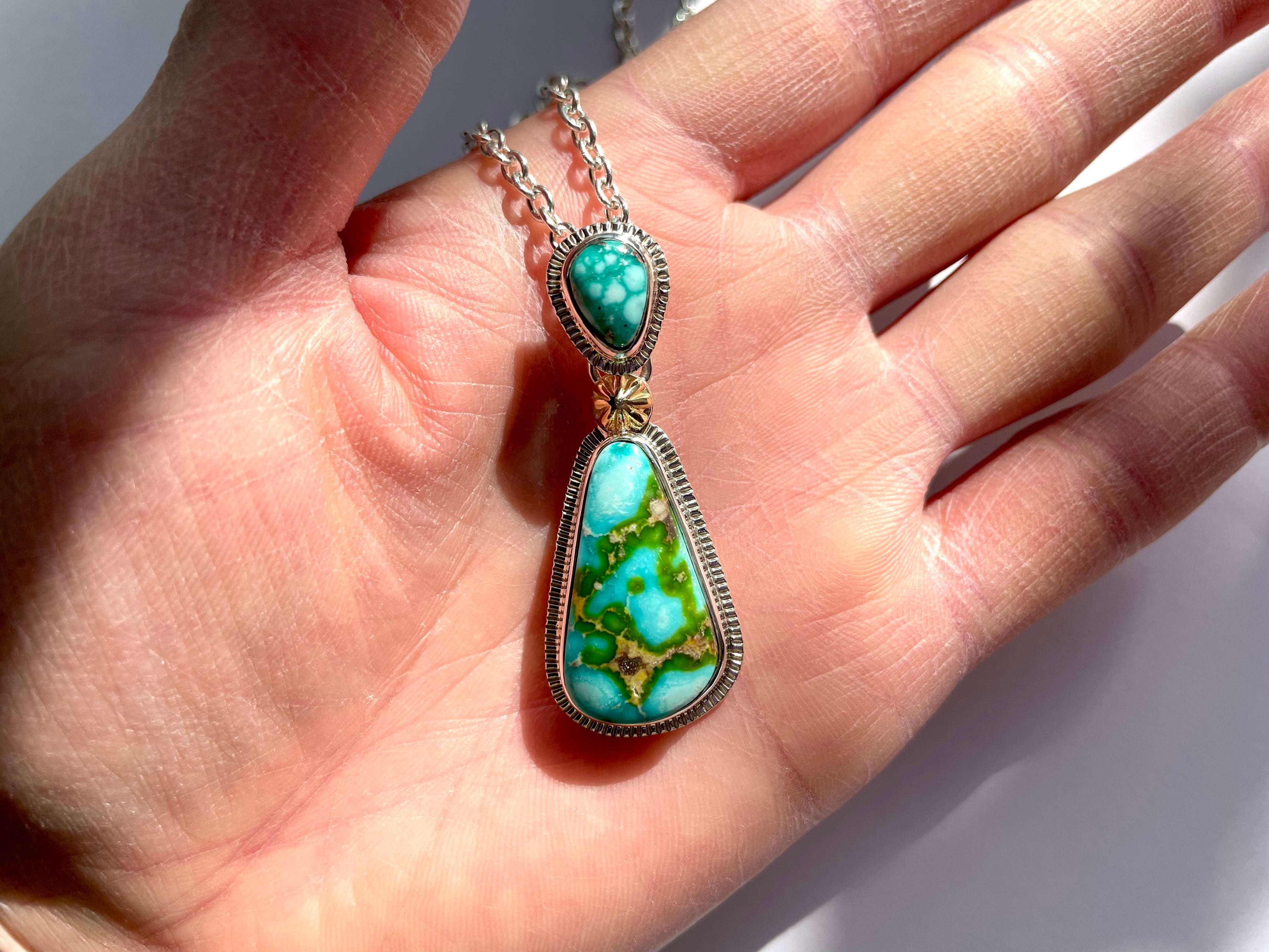 空から海と大地を切り取ったかのような美しいソノランゴールドターコイズと水面のような模様の入ったグレードの良いホワイトウォーターターコイズと合わせペンダントに仕上げました。