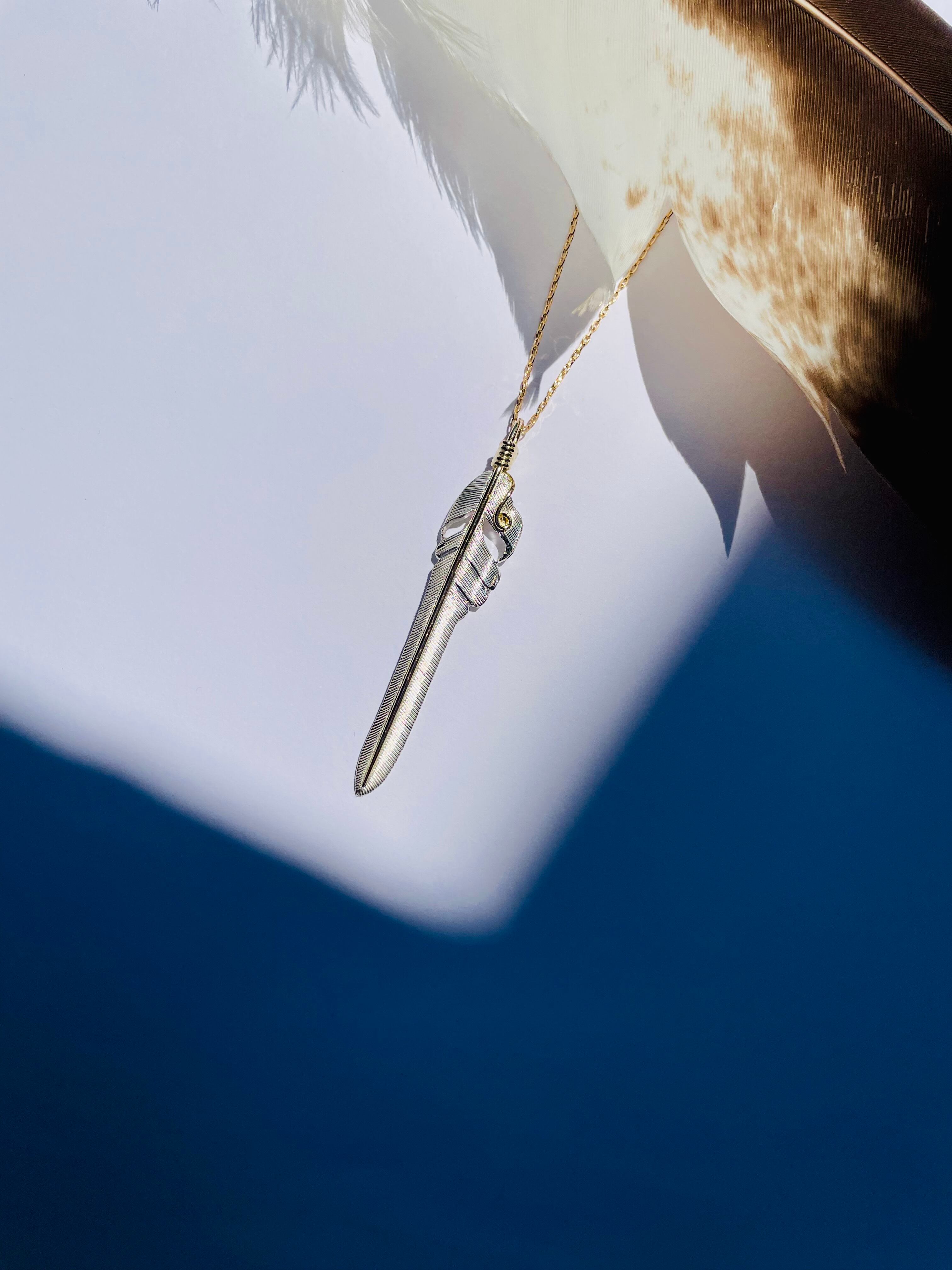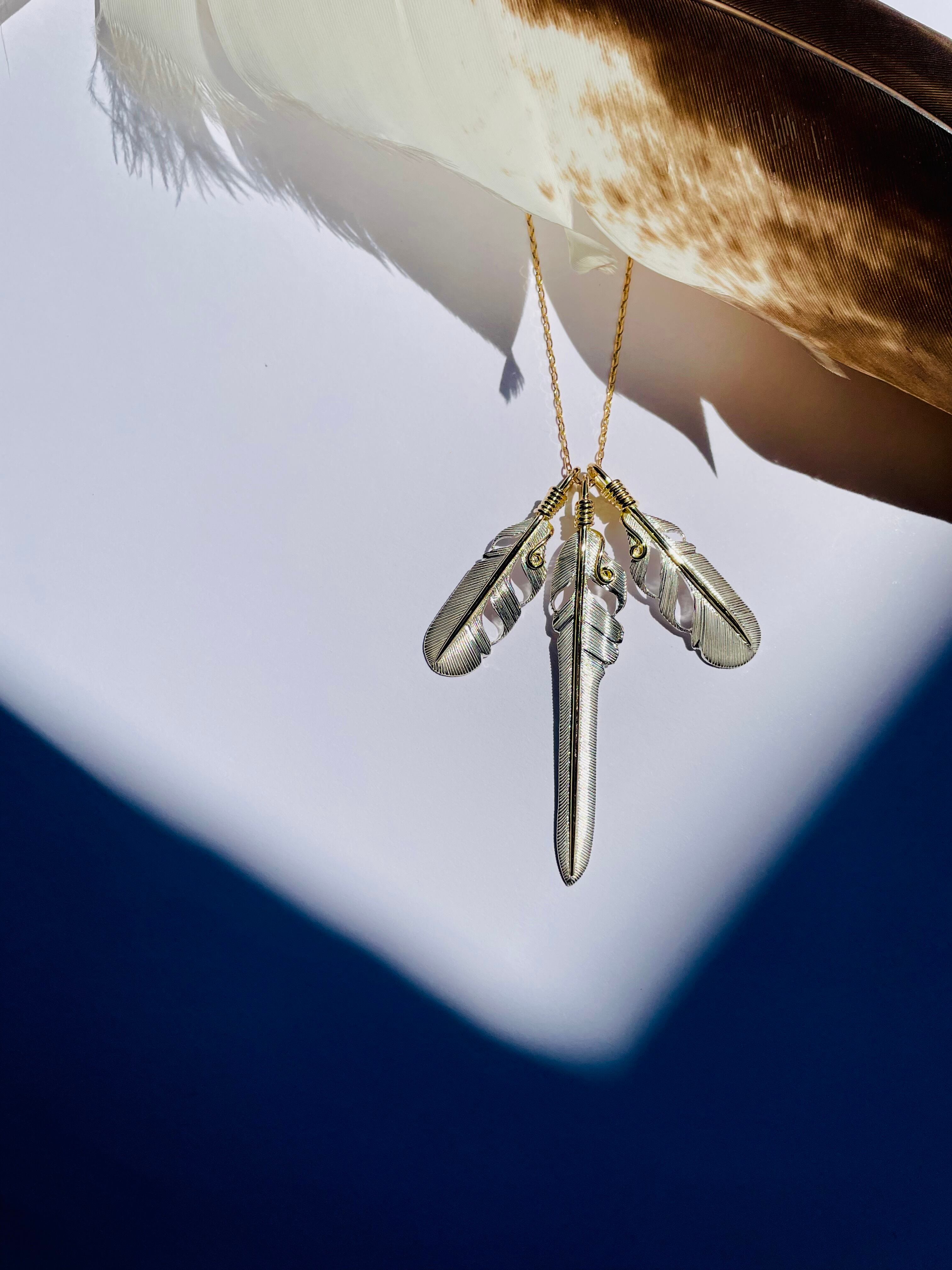 18k Goldを贅沢に使用して羽の芯の部分と羽の根元をくるくると巻いたsilverとgoldを合わせた仕上げになっております。