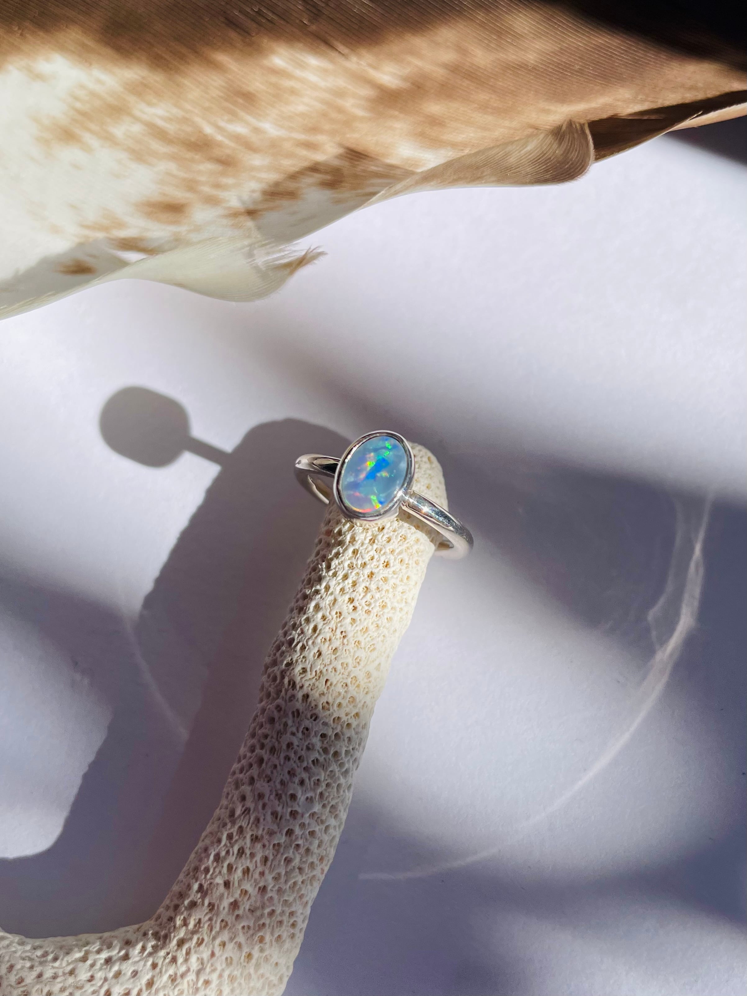 緑、赤、黄色、青と光の角度により美しいキラキラとした遊色効果が現れるオパールのリングになります。